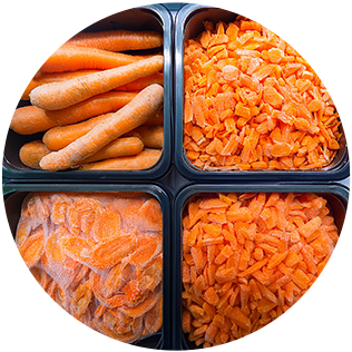 客製化 依照客戶需求的規格進行生鮮截切,如紅蘿蔔小丁、中丁、大丁、絲、片等,可以讓客戶直接烹調。 -
